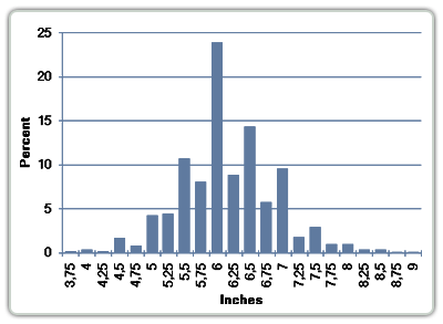 We received exactly 5000 responses to our survey. Of these 5000, we used 4967 due to the large number of outlying data points for the 1" and 9" penis length categories. Participants in the survey were asked to measure length along the top of their erect penises, and girth around the center. The results are formatted in the table below.